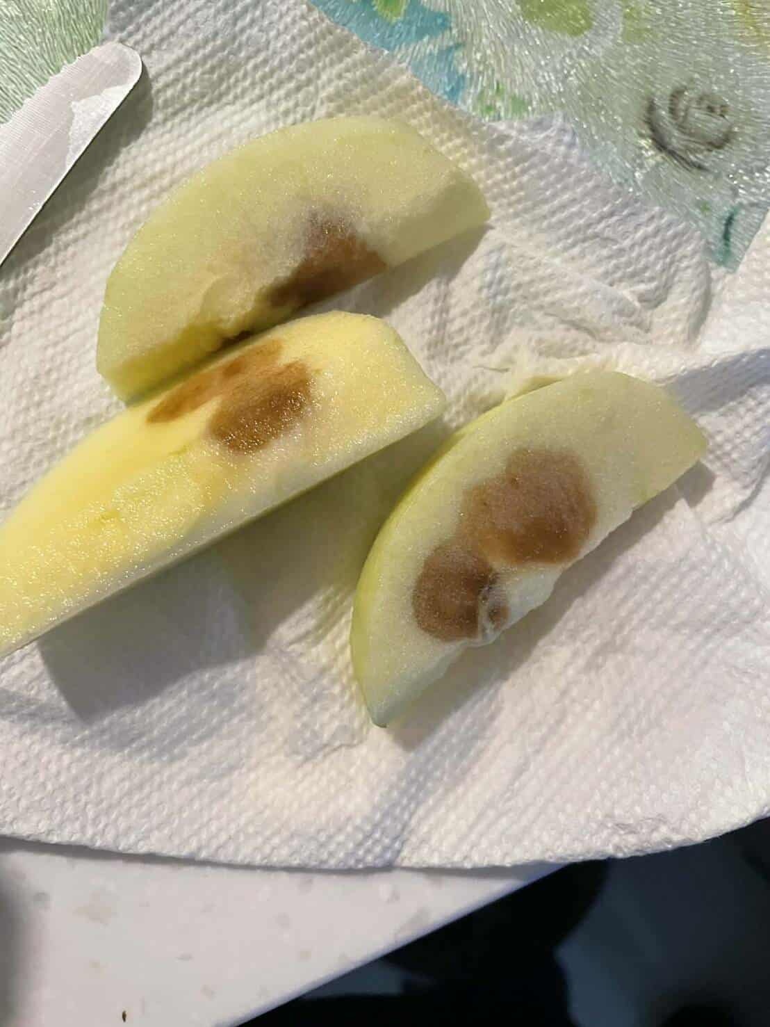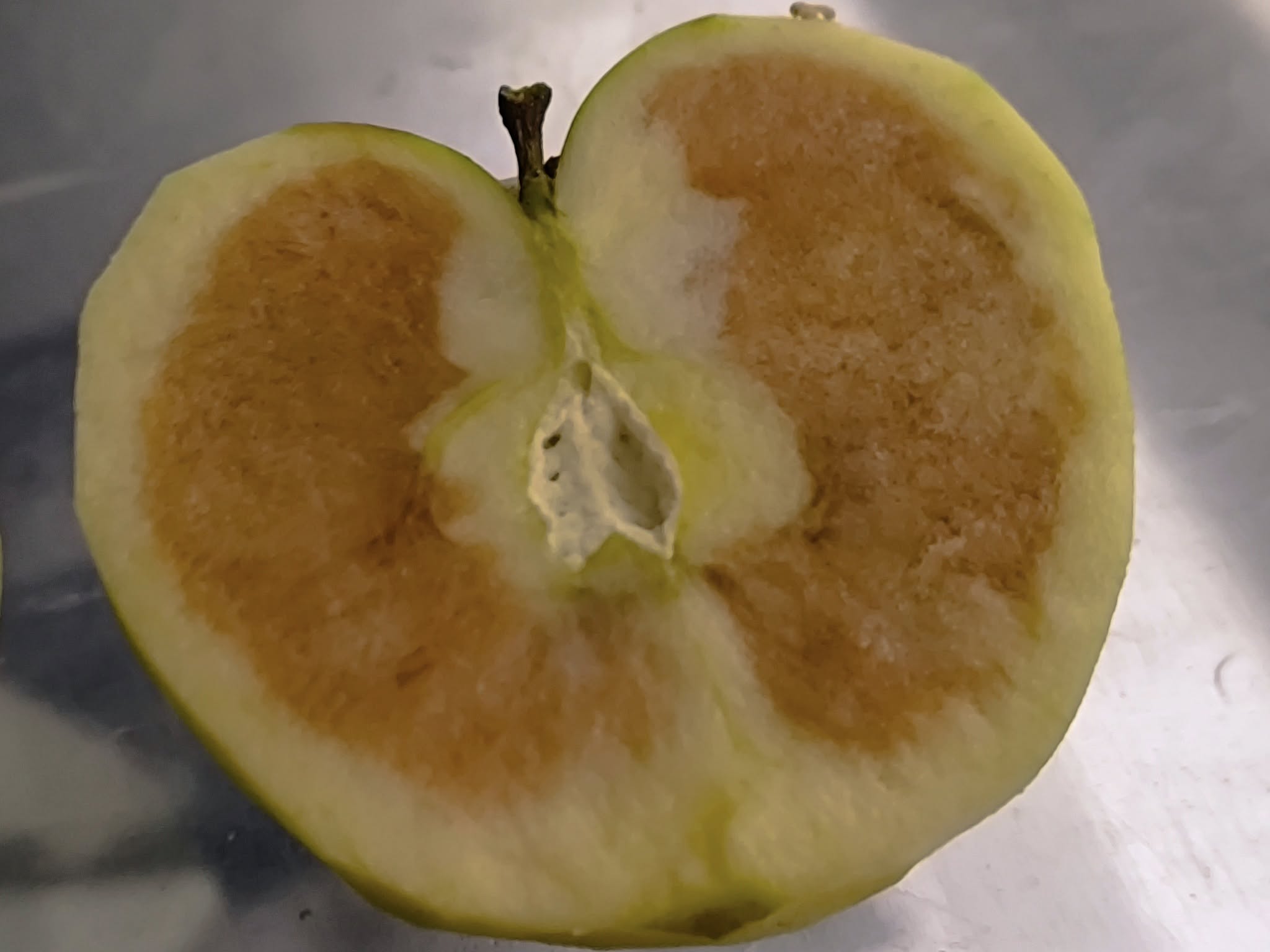 依照片初步判斷並非病蟲害所引起,因徵狀產生並無從傷口或某個起始點開始感染,果實的徵狀發生的非常均勻,研判可能為氣溫、施肥、氣候等多重因素導致果樹在氮肥過多及缺鈣狀況下,容易引起的水心症,若要改善請注意合理化施肥。