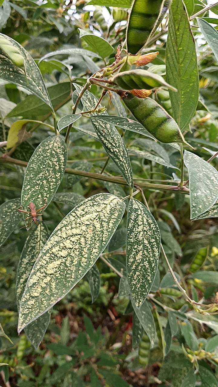 從提供的2張照片,可看見幾項特徵:(1) 葉片的葉肉有白色斑點,但葉脈維持綠色。(2) 全株的葉片都有白斑,老葉比較嚴重,新葉輕微。(3) 第一張左邊樹豆葉片上有一隻緣椿象。這些特徵與豆科植物的病徵、蟲害食痕不同,但與微量元素過多或缺乏的徵狀相似。因為各種作物對微量元素有不同需求,建議就近請植物診療師 (https://www.aphia.gov.tw/ws.php'id=11933) 或診斷服務站到現場看診,以便配合現場情形(包括施肥資訊),提供改善的建議。