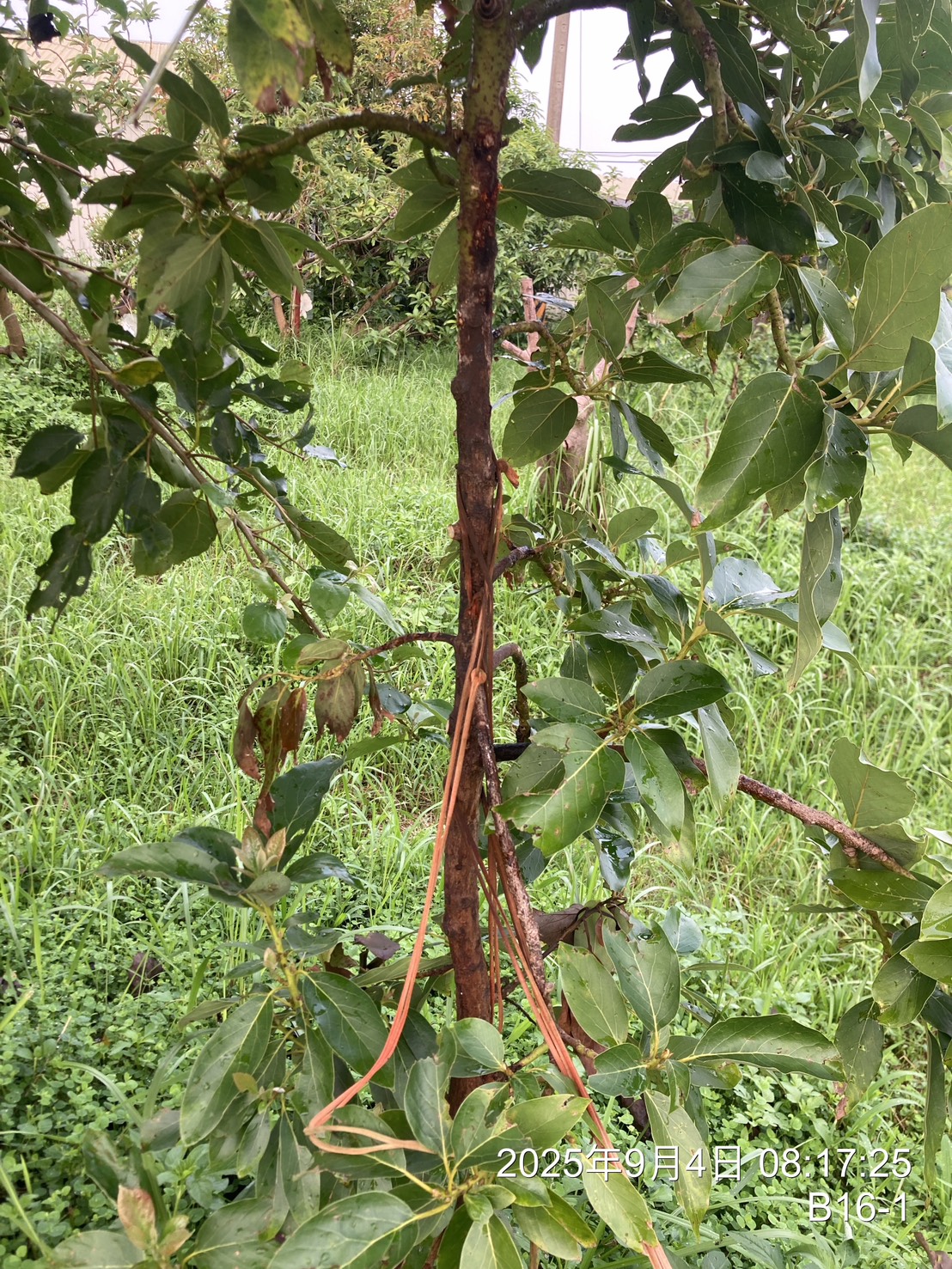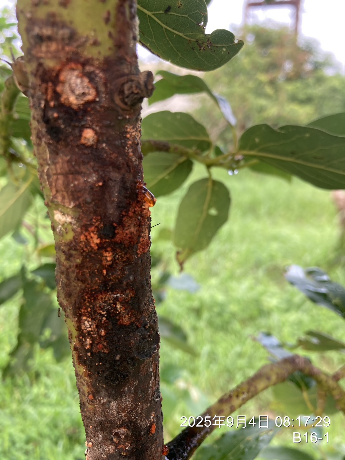 從照片上未能看到明顯的蟲孔,因此研判可能為颱風造成樹幹受損後有病原菌的感染。由於目前尚未看到菌絲等構造,因此可先採裾腐病(流膠病)的處理方式進行,可適度將腐爛潰瘍刮除後使用酪梨疫病的核准使用藥劑防治,另請注意園區下方的通風,避免病原菌滋長。https://otserv2.acri.gov.tw/PPM/PLC0101.aspx'ASParam=bUZ0SyUyNjZuJTFmJTE4JTAycCUxYSUxN3BKWVRkLm5jJTdmZnFyaiUwMSUwMCUwMCUxMA==